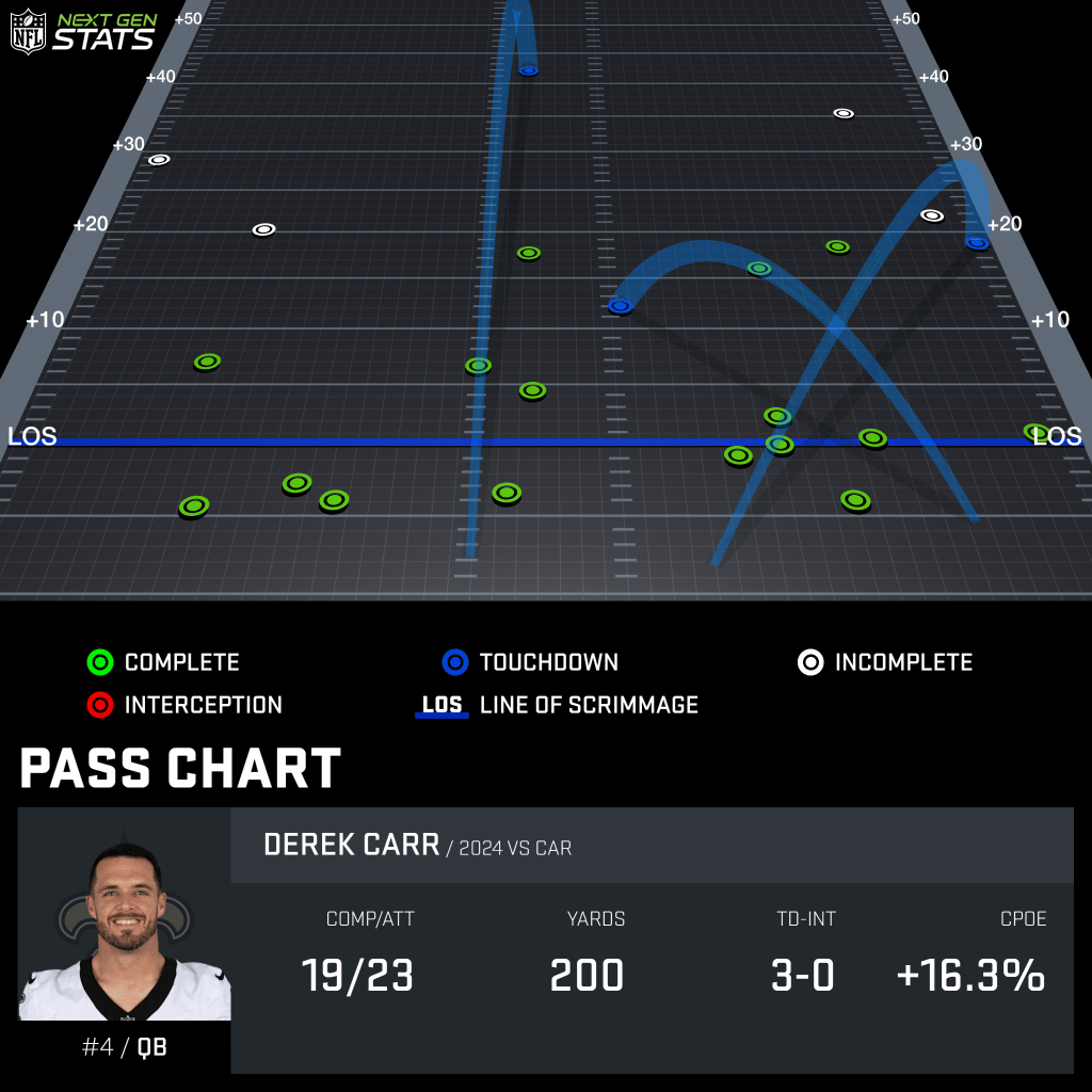 I think the Saints believe in Carr’s ability to throw the deep ball, but against Carolina it was not needed, he only had 5 attempted passes that traveled over 20+ yards in air, and Carr only hit one of those, three minutes into the game Carr hits Rashid Shaheed on a 59-yard touchdown, which was also on one of the five plays where Carolina had created a QB pressure. The other four pressures resulted in high completion percentage passes into the flats.