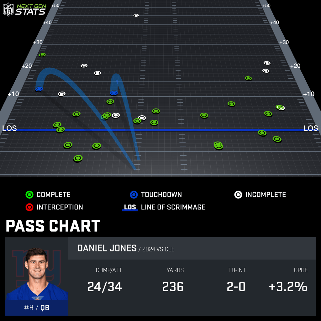 From the chart, Jones likes to keep the play to his left and usually under 10 air yards. On the four completions over 10 yards, 3 of them were to Malik Nabers.