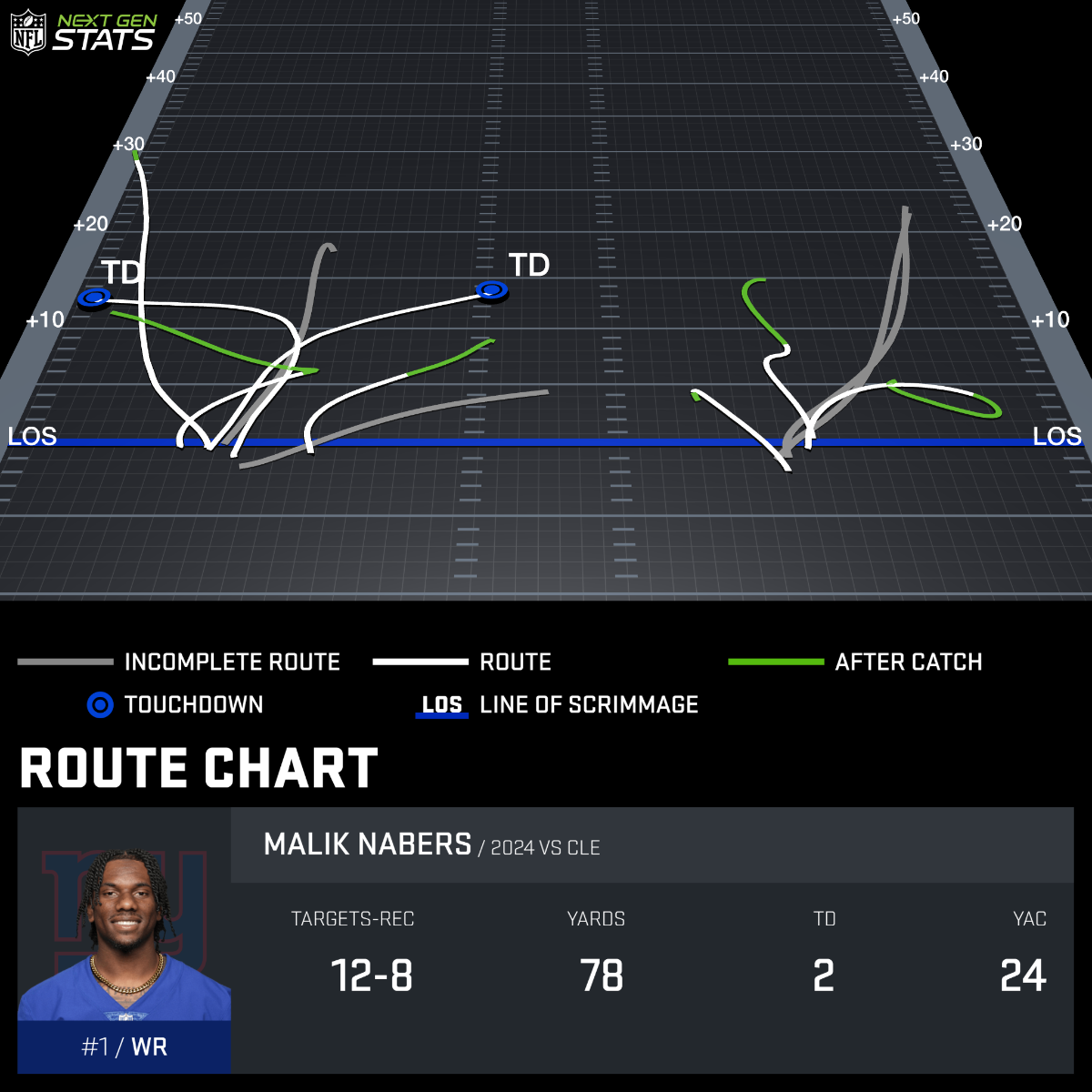 Wan’Dale Robinson is the other main target for Jones, but he is more of the security blanket, he will be running a lot of dump-offs and short underneath routes. 22 of Robinson’s 24 targets have come under 10 yards. The ball travels and average of 4.7 yards in the air on a Robinson target, that number is 10 yards on average to Malik Nabers.