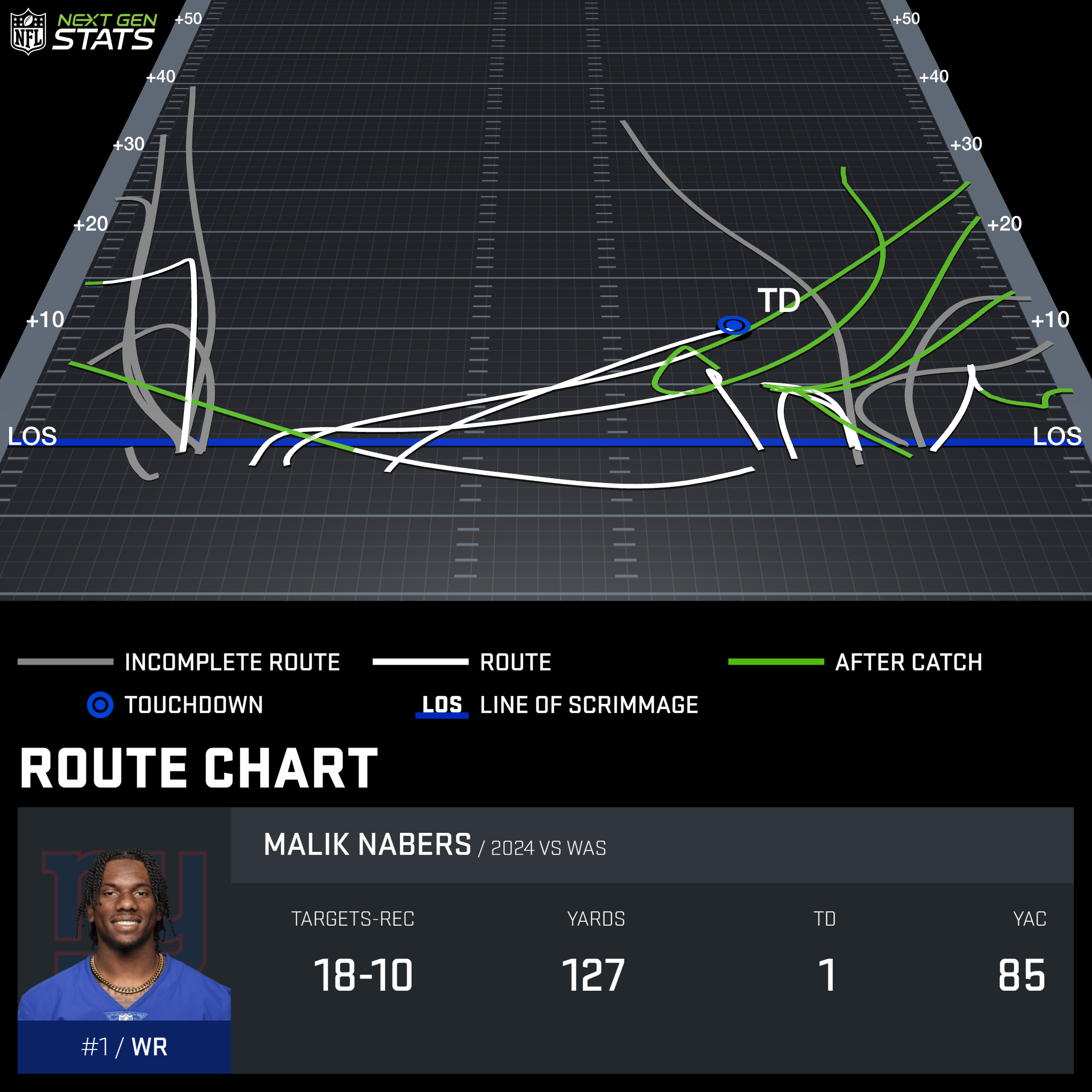 They utilize an RPO offense, meaning each play the QB makes a decision as the ball is snapped to hand off to the running back or decide to pull it back to throw a quick pass, there are designed runs for the QB as well, which works for Jones. We see a lot of the completed passes from pre-snap motion from a target like Nabers or Wan’Dale Robinson, who creates open space for themselves.