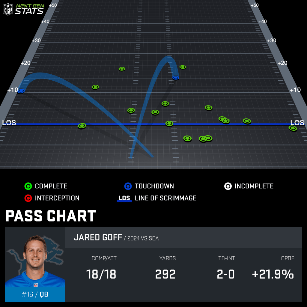 Jared Goff has found a perfect system in Detroit. He is not asked to be a superhero, doesn’t have to throw the ball 40 times a night, sling the deep ball around. He just has to go out there and make smart decisions, keep the ball out of harms way and don’t lose the game. He has targeted in-breaking routes on a league-high 41.1% of his passes this season. Goff has averaged just 6.2 air yards per completion on such passes this season, the 6th-fewest in the NFL. He keeps the ball close and in front of him.