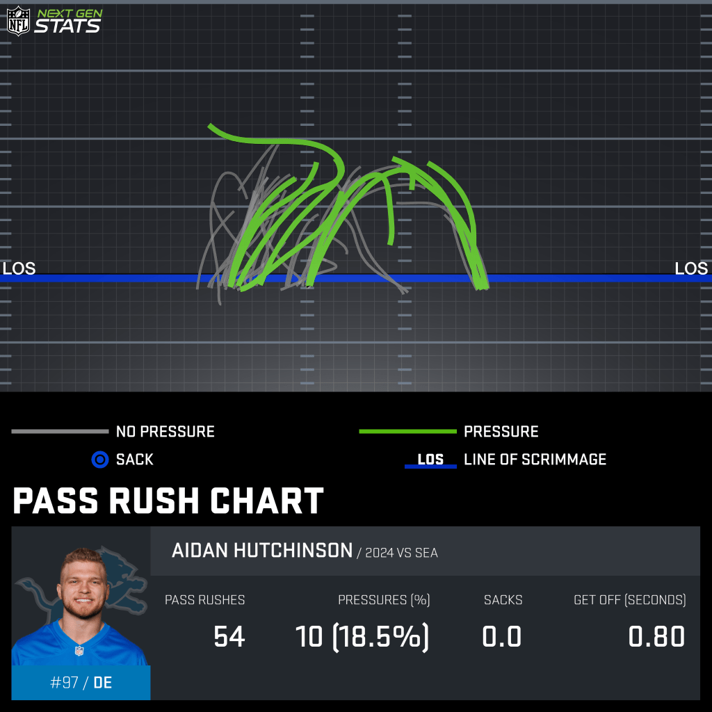 The Lions are good at run fits and defending a rush attack, which will be a test to a Dallas offense that just figured out how to run the ball last week against the Steelers. When it comes to pass defense, the front seven hasn’t created a lot of sacks or pressures. Except for Aiden Hutchinson.