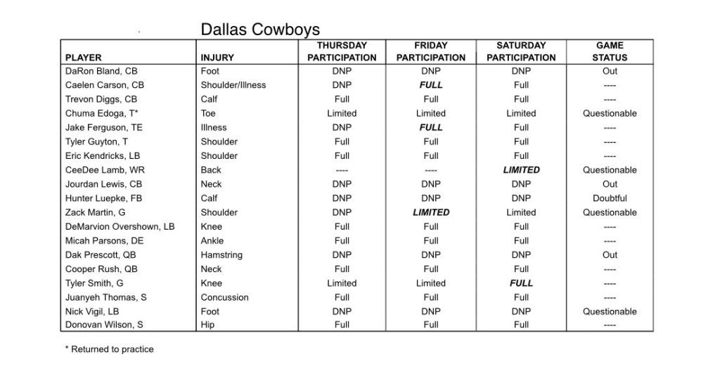 Overcome this injury report. 18 guys started on the report this week, add 1 more as Ceedee Lamb was a late addition and will unlikely play Monday.