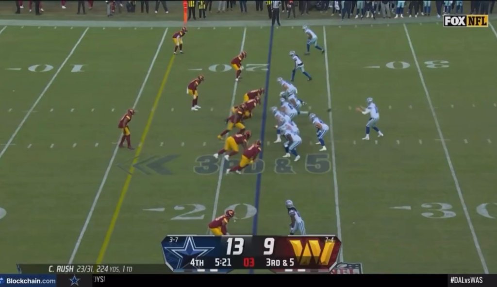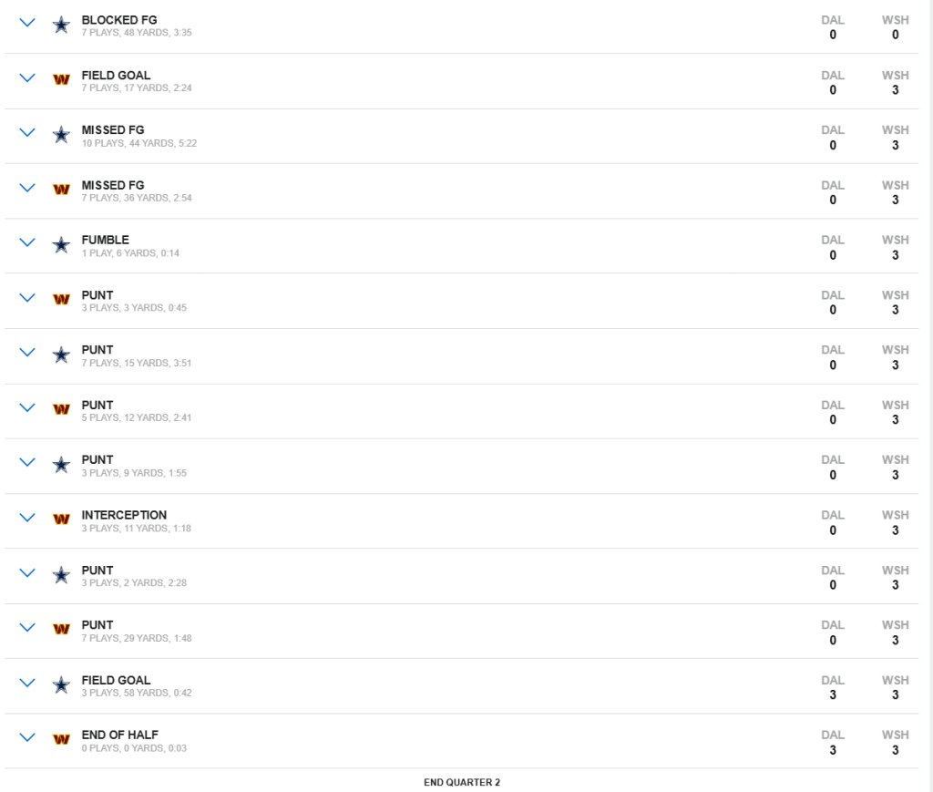 It was blocked by Washington, and it seemed that the story of this game was going to end there. The Commanders get the ball in their territory from the return, but a stop by the Dallas D makes them settle for three.
