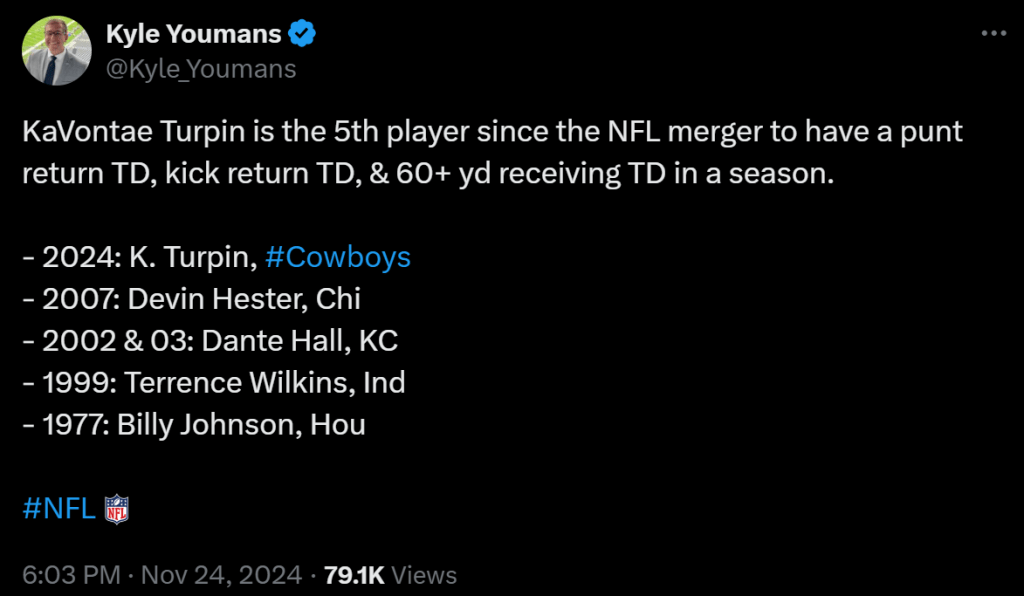 One of the more underrated keys to the Cowboys this season, only if the Cowboys were more competitive where he could really be utilized. Turpin leads the NFL in return average on kicks and has found the endzone a few teams this season.