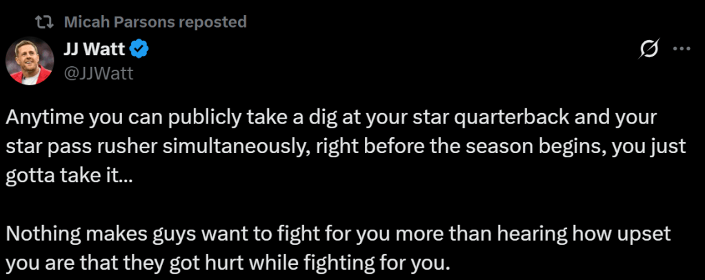 As JJ Watt tweeted this in response to Jerry’s comments. Parsons would share this on his page. In addition Micah would not take too kindly to Jerry speaking about the possible ‘regrets’ of other big contracts, specifically naming Trevon Diggs and Terrence Steele.
