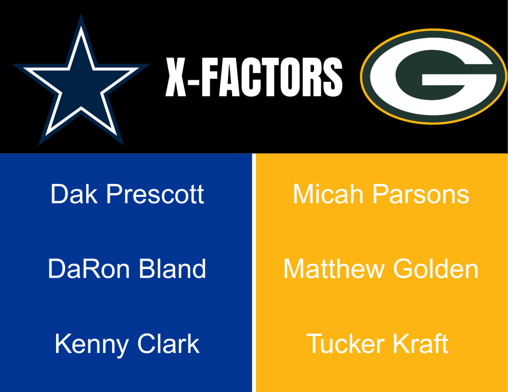 | DaRon Bland: Returning from injury to a chopped up secondary. A lot of pressure to be the savior back there. | Matthew Golden: The rookie WR waiting to have his first breakout game, it seems all WRs have their breakouts against Dallas. |
