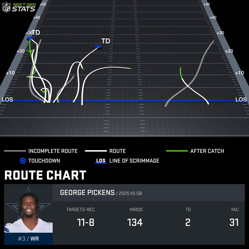 Green Bay played zone on 87.8% of Prescott’s dropbacks, and he responded by completing 29 of 35 passes for 294 yards and all three of his touchdowns. Against man coverage, he attempted just five passes, completing two for 25 yards. Prescott also added a 2-yard rushing score in the second quarter, his first rushing touchdown of the season.